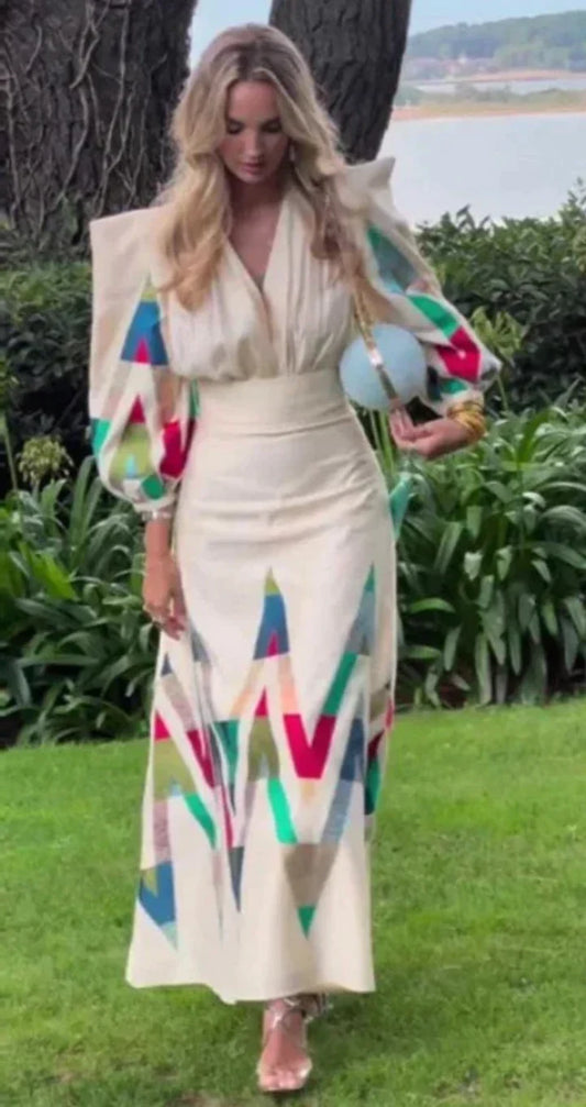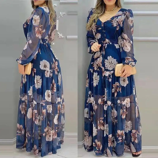 Elegante V-hals Maxi Bloemenjurk met Lange Mouwen