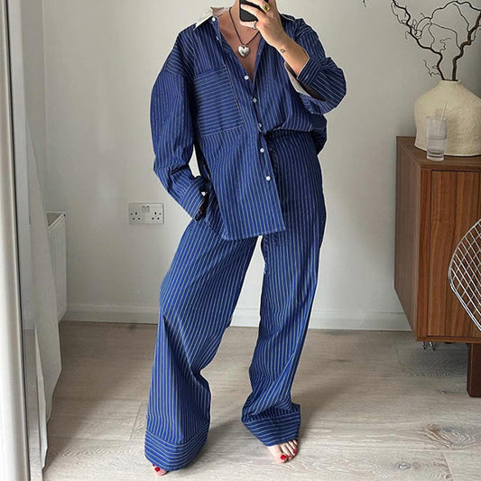 Olympia | Stijlvol blauw gestreept overhemd met lange mouwen en broek Set