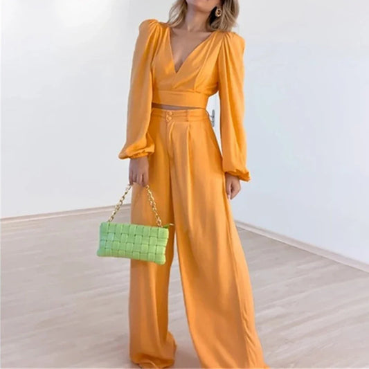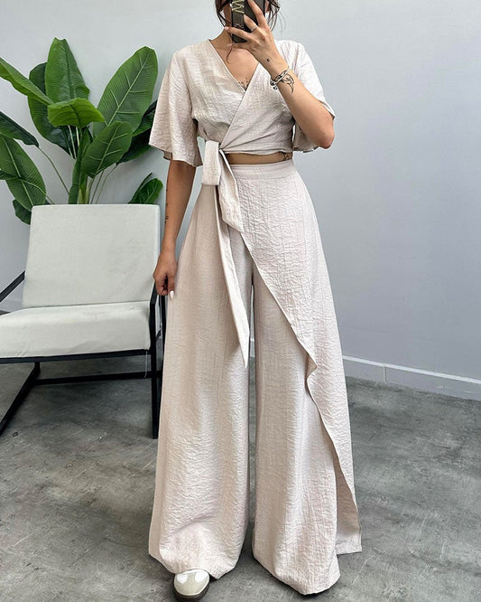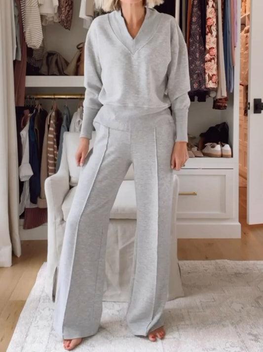 Nicola | Casual V-hals top met kraag & wijde broek set